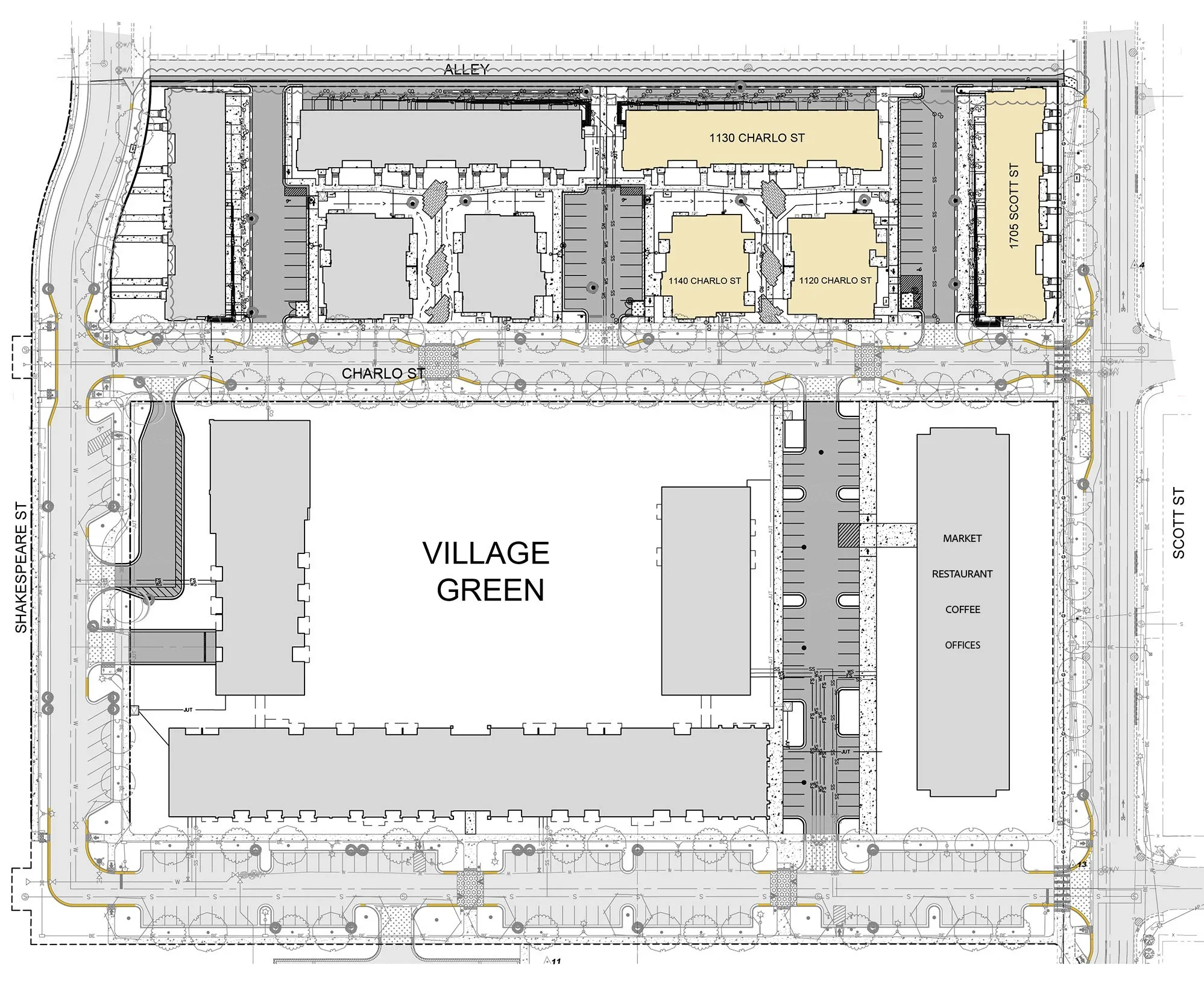 Site plan with 2026 new buildings highlighted in yellow. Click image to enlarge